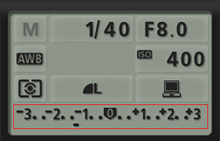 ⓐ 밝은/어두운 사진 : 조리개가 크게 열려서 빛이 많이 들어오거나 셔터가 긴 시간 열려서 빛이 오래 들어오면 사진은 밝게 찍힙니다. 반대로 조리개가 작게 열려서 빛이 조금 들어오거나 셔터가 짧은 시간 열려서 빛이 짧게 들어오면 사진은 어둡게 찍힙니다. 그러므로 우리는 이 둘을 조절하여 들어오는 빛의 양까지 적절하게 맞춰야 합니다. 하지만 크게 걱정하지 않으셔도 됩니다. 노출 표시 바를 참고하시면 됩니다. 노출 표시 바는 뷰파인더나 디스플레이, LCD패널에서 아래와 같은 형태로 확인할 수 있습니다.
