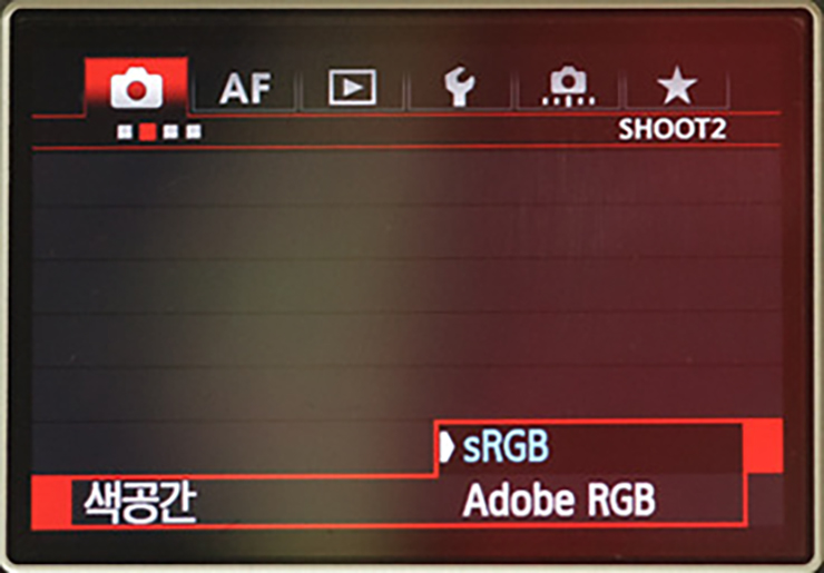 ① 색공간을 sRGB로 선택합니다. (사진에 색을 입히는데 필요한 물감의 종류라 생각하시면 됩니다. sRGB는 웹 등에서 표준으로 사용되는 물감입니다. 색역이 높은 Adobe RGB로 촬영 후, 포토샵 등을 이용해 sRGB로 변환하셔도 좋습니다.)